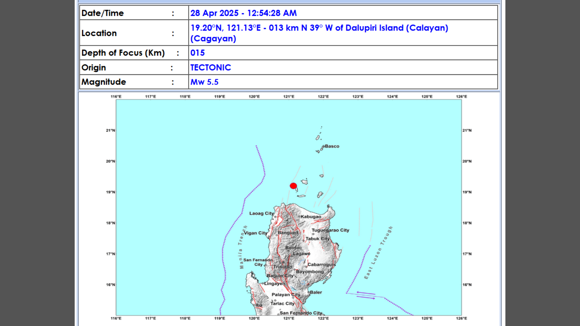 Ayon sa Phivolcs naitala ang magnitude 5.5 na lindol sa 13 kilometers northwest ng Dalupiri Island sa Calayan, 12:54 ng madaling araw.