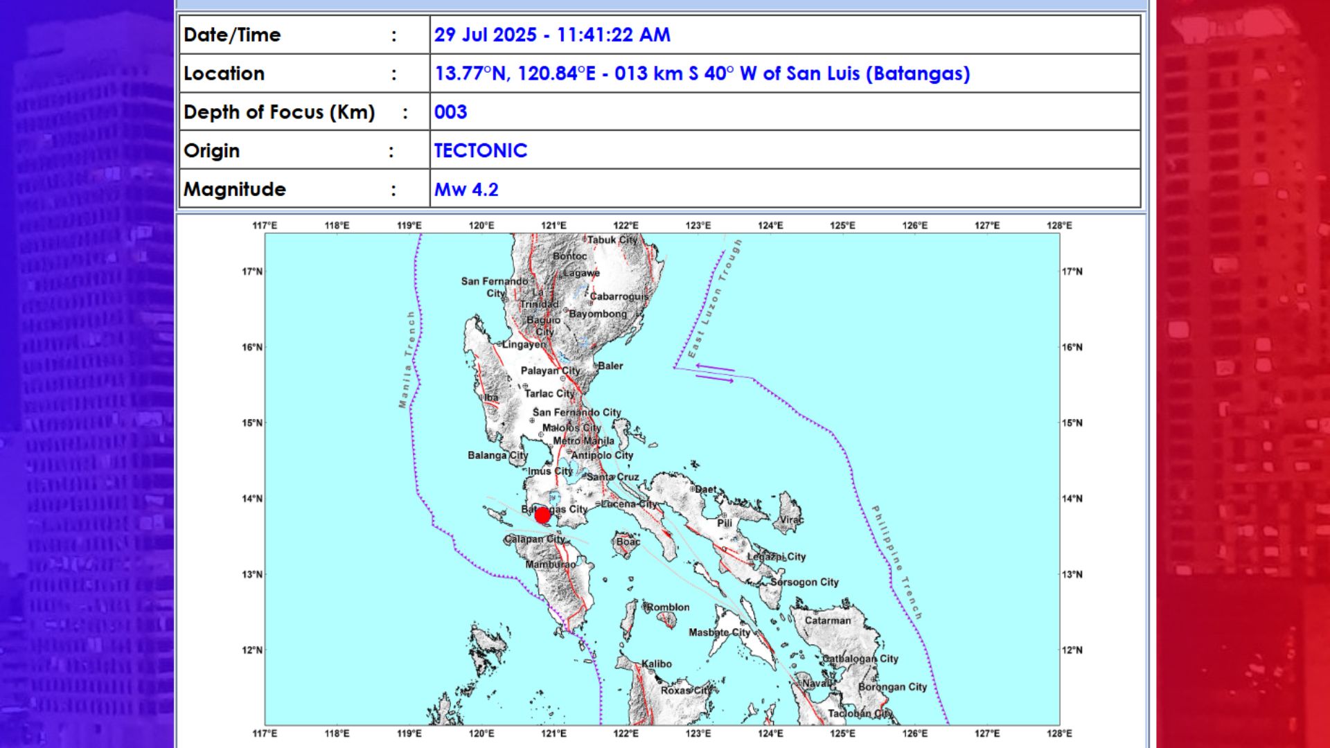 Unang naitala ng Phivolcs ang magnitude 4.2 na lindol sa layong 11 kilometers southwest ng San Luis, 11:39 ng umaga ngayong Mares, July 29.